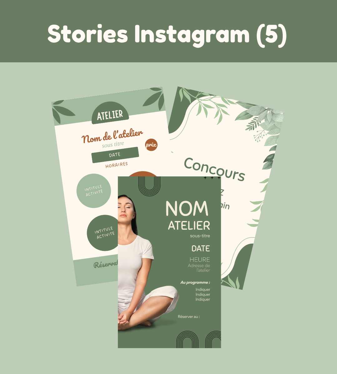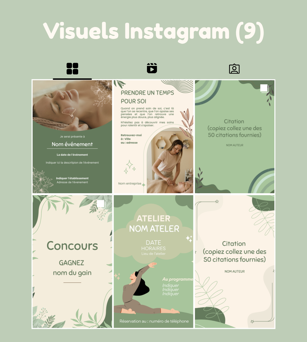 Pack de visuels bien-être (vert) prêt à l’emploi et personnalisables : 9 posts, 5 stories, 1 carrousel, 50 citations bien-être + 2 guides en communication.